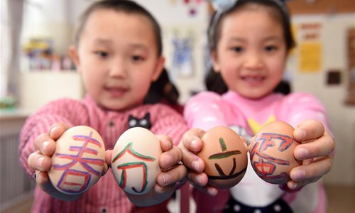 Children show eggs painted with Chinese characters at a kindergarten in Yantai, east China's Shandong Province, March 21, 2018, also the day of "Chunfen". Chunfen, which literally means Spring Equinox or Vernal Equinox, falls on the day when the sun is exactly at the celestial latitude of zero degrees. (Xinhua/Shen Jizhong)