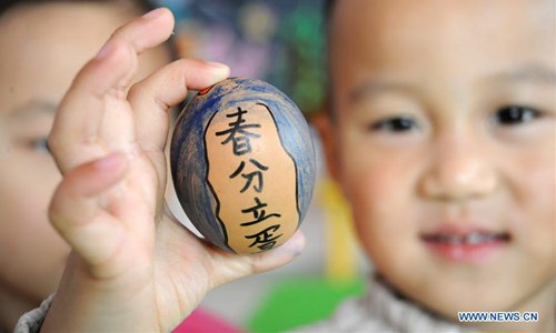 Children show eggs painted with Chinese characters at a kindergarten in Xinle, north China's Hebei Province, March 21, 2018, also the day of "Chunfen". Chunfen, which literally means Spring Equinox or Vernal Equinox, falls on the day when the sun is exactly at the celestial latitude of zero degrees. (Xinhua/Jia Minjie)