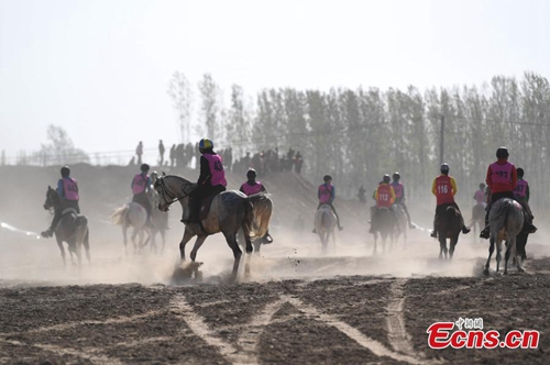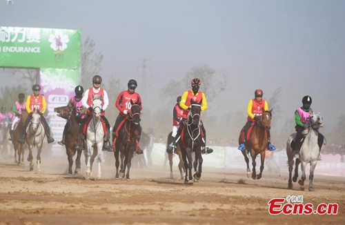 The 2018 China International Equestrian Endurance Competition opens in Dangshan County, East China's Anhui Province, April 8, 2018. More than 100 jockeys from more than 10 countries and regions took part in the race, the highest level of its kind in China, held along the old riverway of the Yellow River. (Photo: China News Service/Han Suyuan)