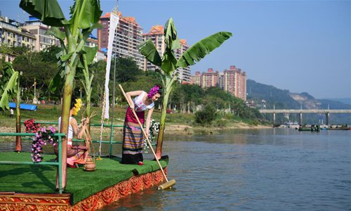 A ceremony is held on the bank of the Lancang River to celebrate the New Year festival of the Dai ethnic group in Jinghong City, Dai Autonomous Prefecture of Xishuangbanna, southwest China's Yunnan Province, April 15, 2018. People sprinkle water to each other to pray for good fortune during the traditional water-sprinkling festival, which is also the New Year festival of the Dai ethnic group. (Xinhua/Hu Chao)