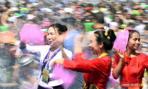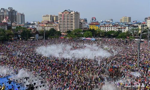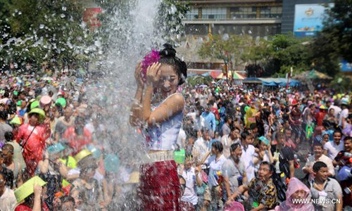 People celebrate the water-sprinkling festival at a square in Jinghong City, Dai Autonomous Prefecture of Xishuangbanna, southwest China's Yunnan Province, April 15, 2018. People sprinkle water to each other to pray for good fortune during the traditional water-sprinkling festival, which is also the New Year festival of the Dai ethnic group. (Xinhua/Wang Changshan)
