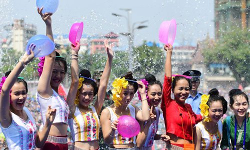 People celebrate the water-sprinkling festival at a square in Jinghong City, Dai Autonomous Prefecture of Xishuangbanna, southwest China's Yunnan Province, April 15, 2018. People sprinkle water to each other to pray for good fortune during the traditional water-sprinkling festival, which is also the New Year festival of the Dai ethnic group. (Xinhua/Hu Chao)