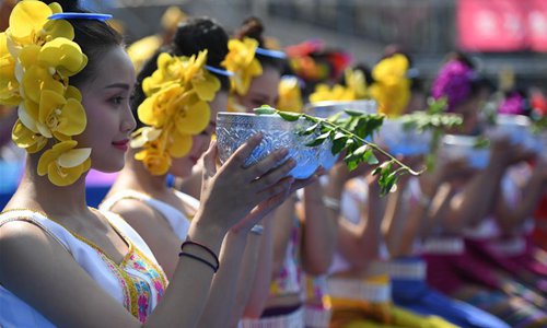 A ceremony is held to celebrate the water-sprinkling festival at a square in Jinghong City, Dai Autonomous Prefecture of Xishuangbanna, southwest China's Yunnan Province, April 15, 2018. People sprinkle water to each other to pray for good fortune during the traditional water-sprinkling festival, which is also the New Year festival of the Dai ethnic group. (Xinhua/Wang Changshan)