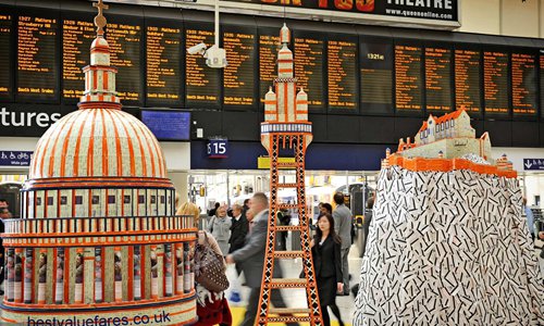 Models of the famed dome of St Paul's Cathedral, Blackpool Tower and Edinburgh Castle, created by sculptor Robert Bradford, were on show in London's Waterloo station on November 11, 2010. The models, made from a total of 115,000 used train tickets, the number of cheap advance tickets sold on average each day in Britain, were put on display for intrigued rail passengers.Photo:VCG