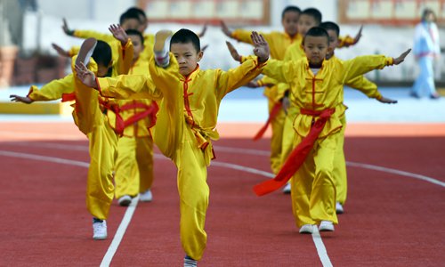 Students from Urumqi practice Kungfu at school in March. Photo: VCG