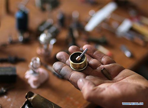 Photo taken on April 25, 2018 shows Palestinian artist Majdi Abu Takeya's artworks at his house in Nuseirat refugee camp, central Gaza Strip. Majdi Abu Takeya, 38, makes small pieces of artworks with gunshots used by the Israeli troops against Palestinian protesters. (Xinhua/Yasser Qudih)