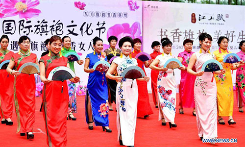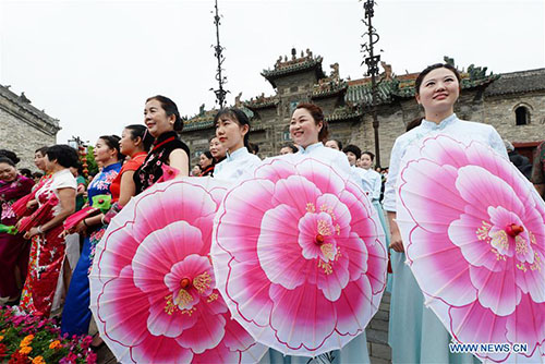 Cheongsam lovers perform during the opening ceremony of a cheongsam cultural festival in Bozhou, east China's Anhui Province, May 5, 2018. A cheongsam cultural festival opened here on Saturday, attracting more than 600 cheongsam lovers from home and abroad. (Xinhua/Liu Qinli)