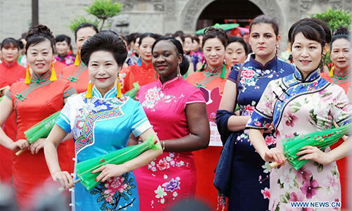 Cheongsam lovers give a show on an ancient street in Bozhou, east China's Anhui Province, May 5, 2018. A cheongsam cultural festival opened here on Saturday, attracting more than 600 cheongsam lovers from home and abroad. (Xinhua/Zhang Yanlin)