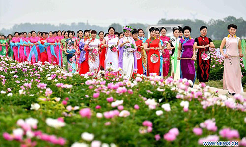 Cheongsam lovers walk in flower fields in Bozhou, east China's Anhui Province, May 5, 2018. A cheongsam cultural festival opened here on Saturday, attracting more than 600 cheongsam lovers from home and abroad. (Xinhua/Liu Qinli)