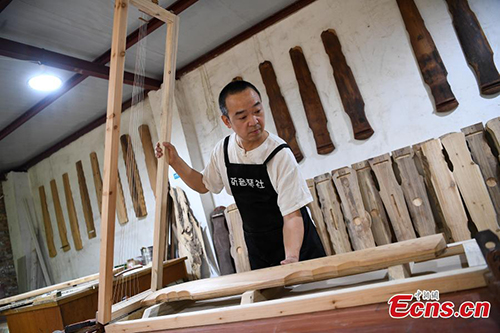 Zhang Hao shows the steps to make a guqin, a Chinese zither, in Xiaoyaotou Village, Taiyuan City, North China’s Shanxi Province, May 14, 2018. The guqin is an ancient stringed-plucked instrument with a history of more than 4,000 years. Zhang makes guqin himself using traditional techniques involving some 200 steps and taking two years. (Photo: China News Service/Wu Junjie)