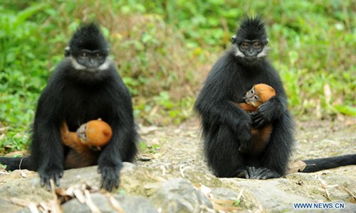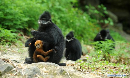 Francois's langurs, an endangered monkey species, stays with babies at the Mayang River national nature reserve in Yanhe Tujia Autonomous County, southwest China's Guizhou Province, May 17, 2018. Over 500 francois's langurs live in the nature reserve and six baby langurs were born recently. (Xinhua/Yang Wenbin)