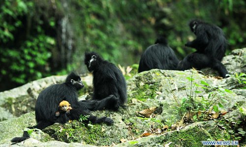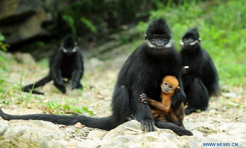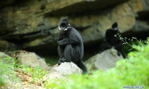 Francois's langurs, an endangered monkey species, are seen at the Mayang River national nature reserve in Yanhe Tujia Autonomous County, southwest China's Guizhou Province, May 17, 2018. Over 500 francois's langurs live in the nature reserve and six baby langurs were born recently. (Xinhua/Yang Wenbin)