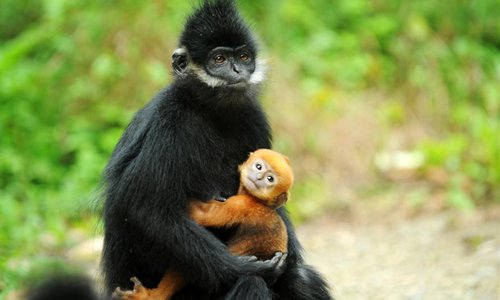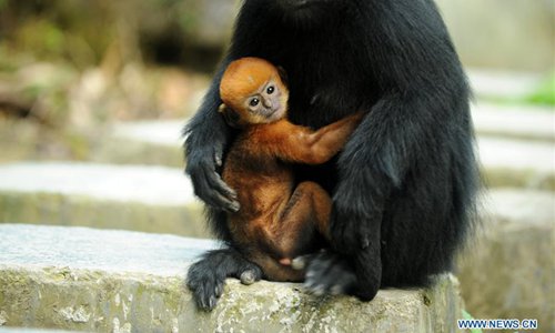 A francois's langur, an endangered monkey species, stays with its baby at the Mayang River national nature reserve in Yanhe Tujia Autonomous County, southwest China's Guizhou Province, May 17, 2018. Over 500 francois's langurs live in the nature reserve and six baby langurs were born recently. (Xinhua/Yang Wenbin)