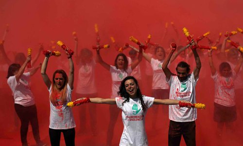 About 500 demonstrators tossed red powder on central Madrid's Puerta del Sol square, representing the blood of the 20,000 bulls that are killed each year in the country. Photo:VCG