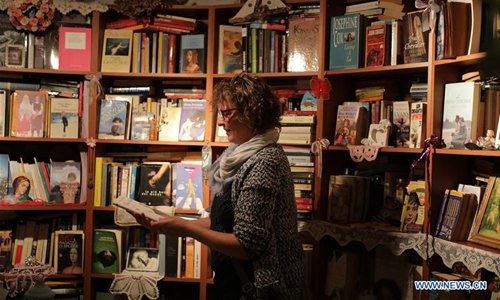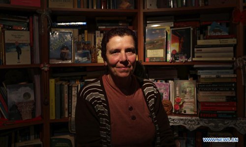 Photo taken on June 1, 2018 shows the owner of the windmill library Stella Papadopoulou in the library in Astypalaia, Greece. The windmill library created in 2011 houses over 2,300 foreign language books donated by tourists and locals. (Xinhua/Lefteris Partsalis)