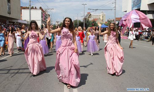 The Rose Queen (C) waves to the guests during the parade of the Rose Festival in the Kazanlak city, Bulgaria, June 3, 2018. The annual Rose Festival is held here in Bulgaria, with activities including rose picking, dance performances and parade. (Xinhua/Zhan Xiaoyi)