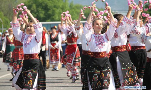 Girls dressed in traditional Bulgarian costumes perform during the Rose Festival in the Kazanlak city, Bulgaria, June 3, 2018. The annual Rose Festival is held here in Bulgaria, with activities including rose picking, dance performances and parade. (Xinhua/Zhan Xiaoyi)