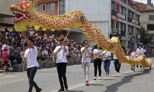 People perform dragon dance during the parade of the Rose Festival in the Kazanlak city, Bulgaria, June 3, 2018. The annual Rose Festival is held here in Bulgaria, with activities including rose picking, dance performances and parade. (Xinhua/Zhan Xiaoyi)