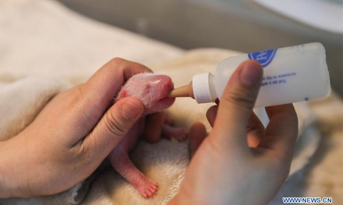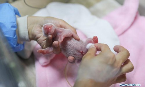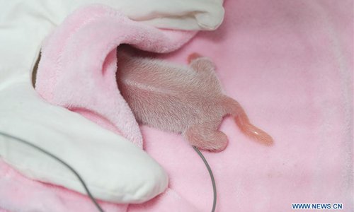 Photo taken on June 5, 2018 shows the female cub of the male-female panda twins at the Chengdu Research Base of Giant Panda Breeding in southwest China's Sichuan Province. Panda Ya Yun gave birth to the first male-female panda twins of this year Tuesday morning. The female cub weighed 135.3 grams and was born at 8:20 a.m. The male cub followed nine minutes later, weighing 148.8 grams. (Xinhua)