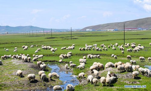 A flock of sheep graze on the Hulunbuir grassland in north China's Inner Mongolia Autonomous Region, June 7, 2018. (Xinhua/Liu Lei)