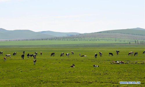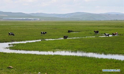 Cattle graze on the Hulunbuir grassland in north China's Inner Mongolia Autonomous Region, June 7, 2018. (Xinhua/Liu Lei)