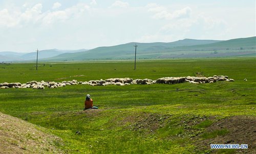 A shepherd grazes sheep on the Hulunbuir grassland in north China's Inner Mongolia Autonomous Region, June 7, 2018. (Xinhua/Liu Lei)