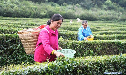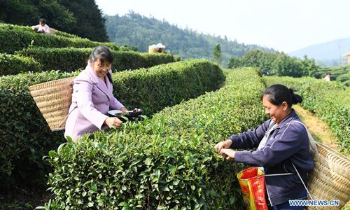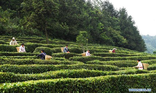 People pick tea leaves at the Tianchiping tea planting base of Baoyan Village in the Wulong District of Chongqing, southwest China, June 13, 2018. Tea planting industry has become one of the pillar industries to help reduce poverty and revitalizing rural area in the Wulong District. By the end of 2017, the tea planting area covered 3,680 hectares and the total output exceeded 200 million RMB yuan (31 miliion U.S. dollars). (Xinhua/Wang Quanchao)