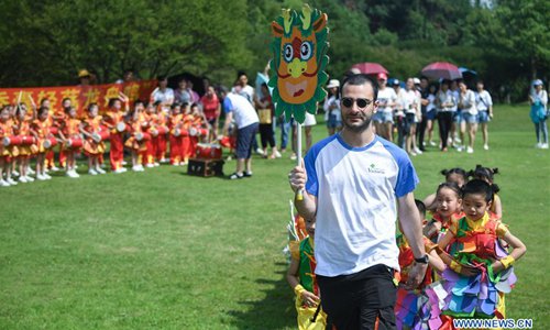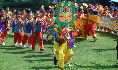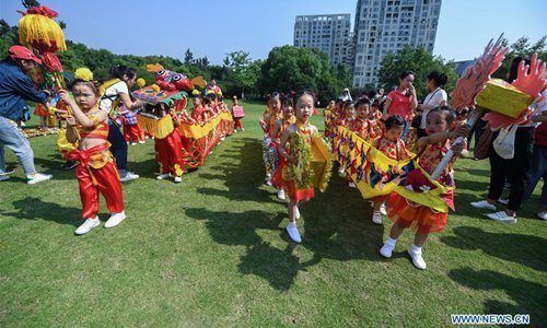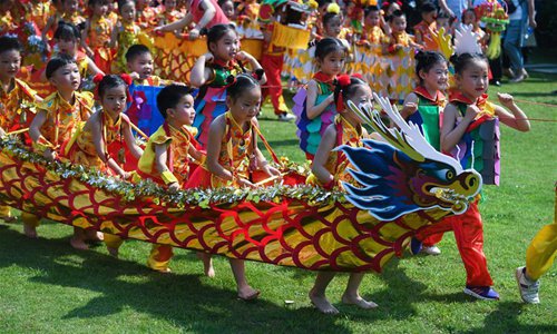 Children play the drums for a land dragon boat racing activity to greet the upcoming Dragon Boat Festival at a kindergarten in Changxing County, east China's Zhejiang Province, June 14, 2018. (Xinhua/Xu Yu)