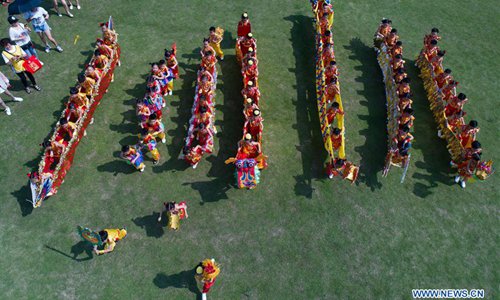 Aerial photo taken on June 14, 2018 shows children taking part in a land dragon boat racing activity to greet the upcoming Dragon Boat Festival at a kindergarten in Changxing County, east China's Zhejiang Province. (Xinhua/Xu Yu)