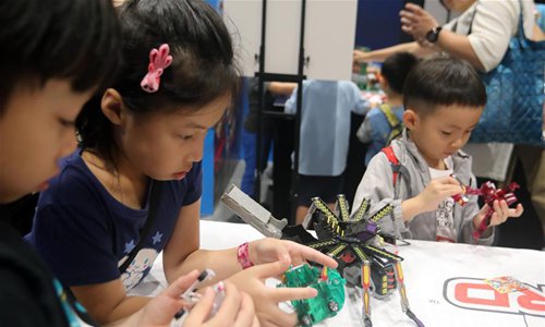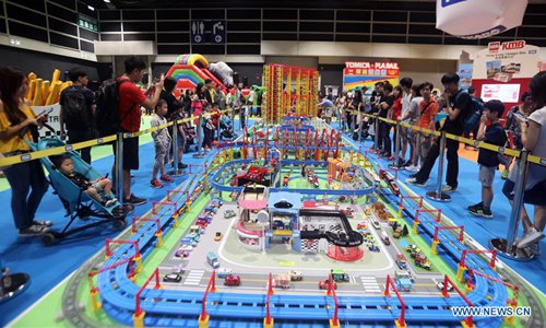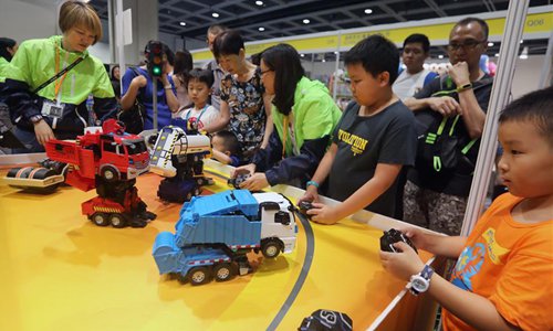 Children play with toys during the 4th Hong Kong Toy Festival in Hong Kong, south China, June 15, 2018. The three-day festival kicked off here on Friday. (Xinhua/Li Peng)