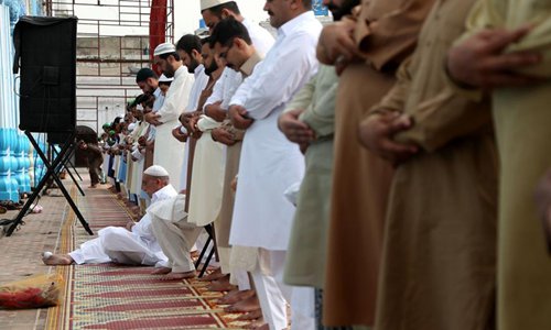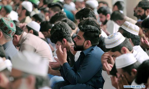 Pakistani muslims pray during Eid al-Fitr prayers at the Jamia Mosque in Rawalpindi, Pakistan, on June 16, 2018. (Xinhua/Ahmad Kamal)
