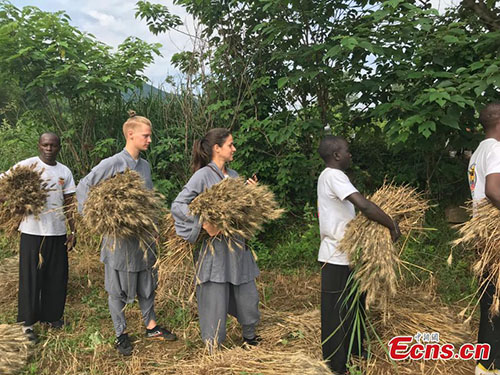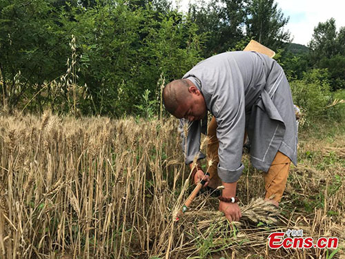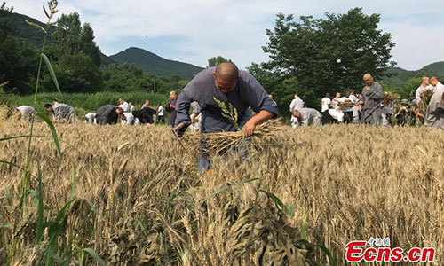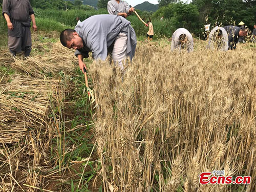 Monks from the Shaolin Temple harvest wheat at a farm in Dengfeng, Henan Province, June 21, 2018. A total of 120 mu, equivalent to eight hectares, of farmland was planted with wheat this year. (Photo: China News Service/Han Zhangyun)