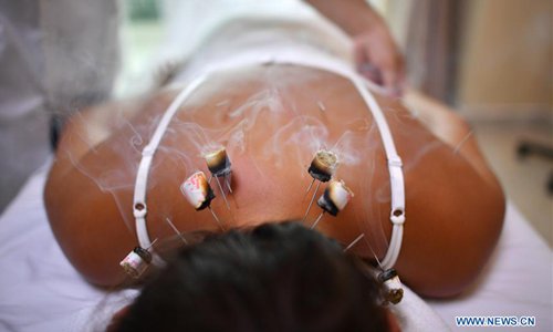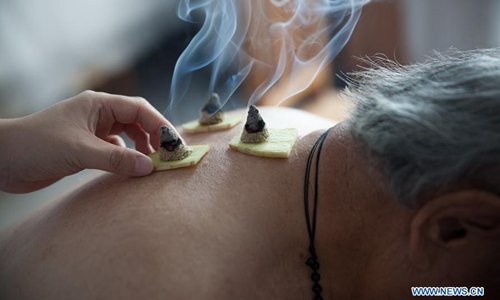 File photo taken on July 12, 2017 shows a patient receiving moxibustion treatment at a traditional Chinese medicine hospital in Gaoqing County, east China's Shandong Province. Traditional Chinese medicine (TCM), one of the world's oldest forms of medicine with different practices including acupuncture, bee-sting therapy, cupping, moxibustion, scrapping, tui na (Chinese therapeutic massage), still prevails in the modern society after thousands of years of evolution, during which generations have restored and maintained health depending on it. The World Health Organization disease index was updated to include references to traditional Chinese medicine for the first time in June 2018. (Xinhua/Zhang Weitang)