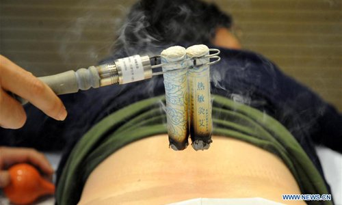 File photo taken on Sept. 29, 2010 shows a tourist experiencing moxibustion treatment at the Expo Park in Shanghai, east China. Traditional Chinese medicine (TCM), one of the world's oldest forms of medicine with different practices including acupuncture, bee-sting therapy, cupping, moxibustion, scrapping, tuinaing, tui na (Chinese therapeutic massage), still prevails in the modern society after thousands of years of evolution, during which generations have restored and maintained health depending on it. The World Health Organization disease index was updated to include references to traditional Chinese medicine for the first time in June 2018. (Xinhua)
