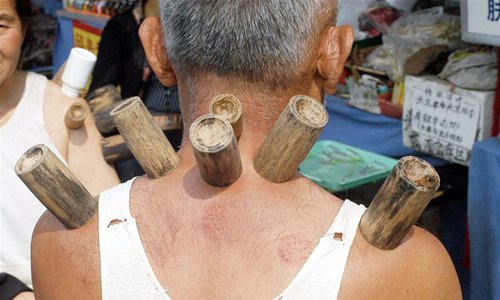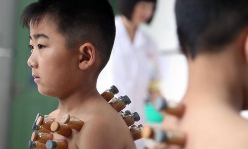 File photo taken on June 21, 2014 shows a boy experiencing cupping treatment at Kangyide Hospital in Beijing, capital of China. Traditional Chinese medicine (TCM), one of the world's oldest forms of medicine with different practices including acupuncture, bee-sting therapy, cupping, moxibustion, scrapping, tui na (Chinese therapeutic massage), still prevails in the modern society after thousands of years of evolution, during which generations have restored and maintained health depending on it. The World Health Organization disease index was updated to include references to traditional Chinese medicine for the first time in June 2018. (Xinhua)