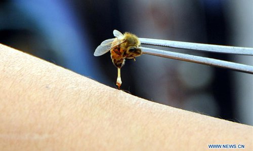 File photo taken on Sept. 20, 2010 shows bee-sting therapy, a kind of traditional Chinese Medicine practice using honey bee for treatment, in Shijiazhuang, capital of north China's Hebei Province. Traditional Chinese medicine (TCM), one of the world's oldest forms of medicine with different practices including acupuncture, bee-sting therapy, cupping, moxibustion, scrapping, tui na (Chinese therapeutic massage), still prevails in the modern society after thousands of years of evolution, during which generations have restored and maintained health depending on it. The World Health Organization disease index was updated to include references to traditional Chinese medicine for the first time in June 2018. (Xinhua/Gong Zhihong)