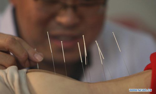 File photo taken on March 11, 2011 shows a doctor practicing acupuncture at a clinic in Beijing, capital of China. Traditional Chinese medicine (TCM), one of the world's oldest forms of medicine with different practices including acupuncture, bee-sting therapy, cupping, moxibustion, scrapping, tui na (Chinese therapeutic massage), still prevails in the modern society after thousands of years of evolution, during which generations have restored and maintained health depending on it. The World Health Organization disease index was updated to include references to traditional Chinese medicine for the first time in June 2018. (Xinhua)