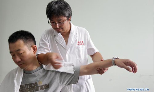 File photo taken on July 29, 2010 shows a doctor providing tui na treatment for a patient at a hospital of the Tongrentang, a renowned traditional Chinese medicine maker, in Beijing, capital of China. Traditional Chinese medicine (TCM), one of the world's oldest forms of medicine with different practices including acupuncture, bee-sting therapy, cupping, moxibustion, scrapping, tui na (Chinese therapeutic massage), still prevails in the modern society after thousands of years of evolution, during which generations have restored and maintained health depending on it. The World Health Organization disease index was updated to include references to traditional Chinese medicine for the first time in June 2018. (Xinhua/Xing Guangli)