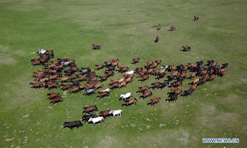 A herd of horses are seen on the grassland in Shandan Horse Ranch in the Hexi Corridor, northwest China's Gansu Province, June 21, 2018. (Xinhua/Fan Peishen)