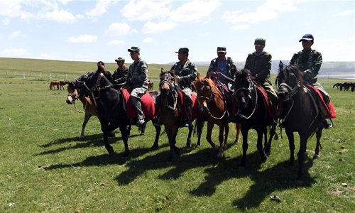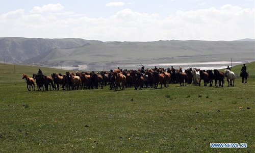 Herdsmen ride on horses on the grassland in Shandan Horse Ranch in the Hexi Corridor, northwest China's Gansu Province, June 21, 2018. (Xinhua/Fan Peishen)