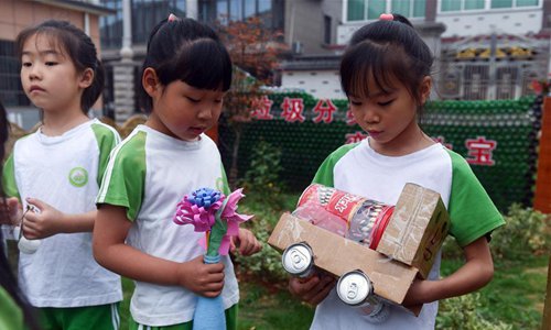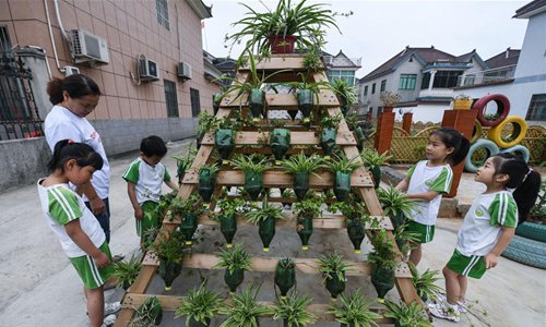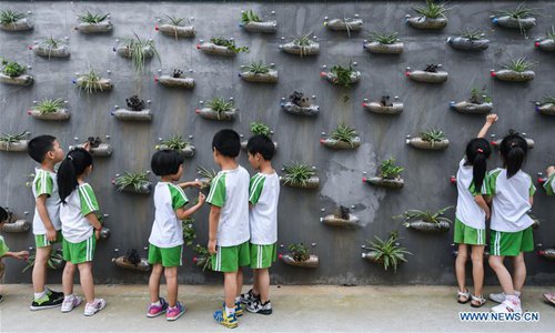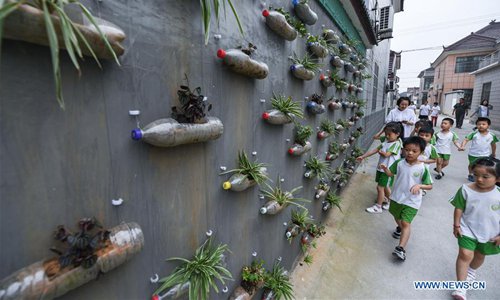 Children view plants potted in waste plastic bottles in Liujiadu New Village of Changxing County, east China's Zhejiang Province, June 22, 2018. An activity was held here for children to know about garbage classification. (Xinhua/Xu Yu)