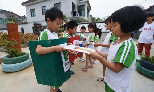 Children take part in game to learn how to classify garbage in Liujiadu New Village of Changxing County, east China's Zhejiang Province, June 22, 2018. An activity was held here for children to know about garbage classification. (Xinhua/Xu Yu)