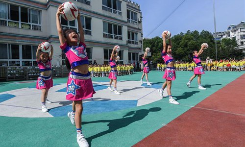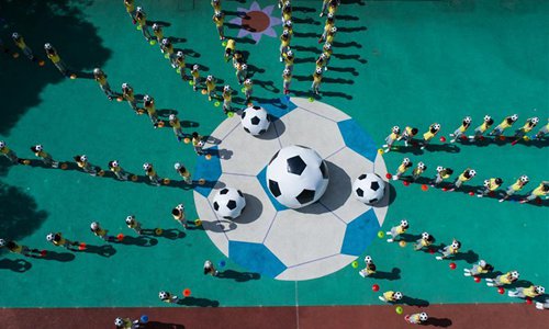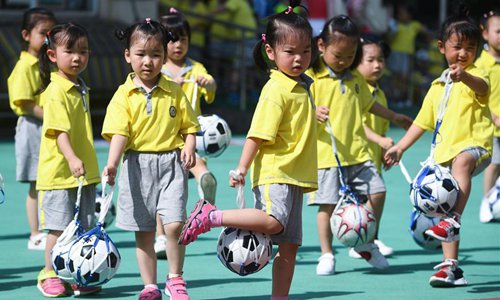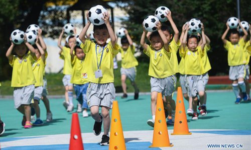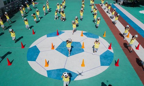 Children perform in a football show at the Central Kindergarten in Changxing County, east China's Zhejiang Province, June 26, 2018. The kindergarten held a football festival, during which children could enjoy the fun of playing football. (Xinhua/Xu Yu)