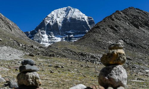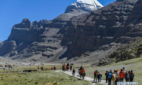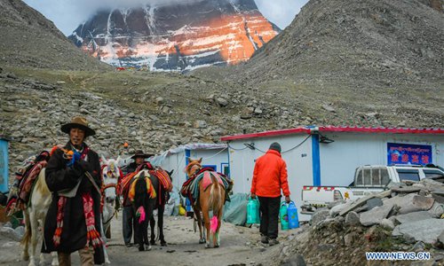 People walk on the foot of the Mount Kangrinboqe in Burang County of Ngari Prefecture, southwest China's Tibet Autonomous Region, June 24, 2018. (Xinhua/Liu Dongjun)