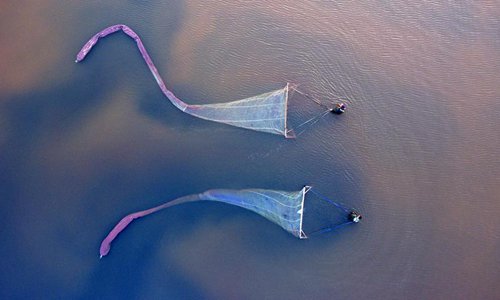 Two workers harvest brine shrimp which is quality feed in aquaculture in the Salt Lake in Yuncheng, north China's Shanxi Province, July 6, 2018. (Xinhua/Cao Yang)
