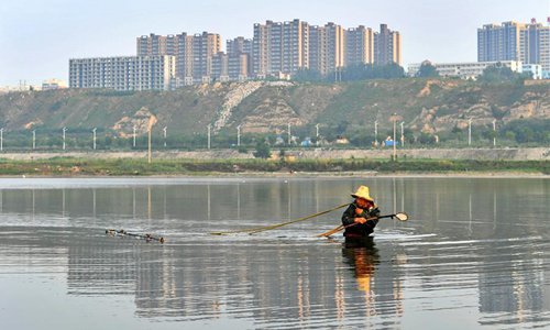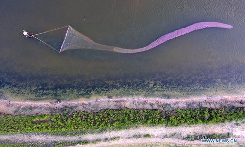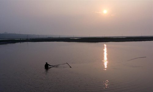 A worker harvests brine shrimp which is quality feed in aquaculture in the Salt Lake in Yuncheng, north China's Shanxi Province, July 6, 2018. (Xinhua/Cao Yang)