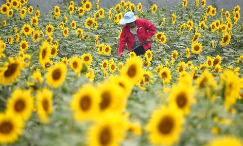 A woman works in the field at Huoshigou Village in the Shanting District of Zaozhuang, east China's Shandong Province, July 7, 2018. Saturday marks Xiaoshu, or Lesser Heat, the 11th of the 24 solar terms in the Chinese lunar calendar which means the beginning of hot summer. (Xinhua/Liu Mingxiang)