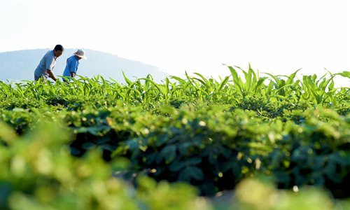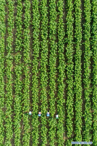 People work in the field at Xuwa Village in the Shanting District of Zaozhuang, east China's Shandong Province, July 7, 2018. Saturday marks Xiaoshu, or Lesser Heat, the 11th of the 24 solar terms in the Chinese lunar calendar which means the beginning of hot summer. (Xinhua/Liu Mingxiang)