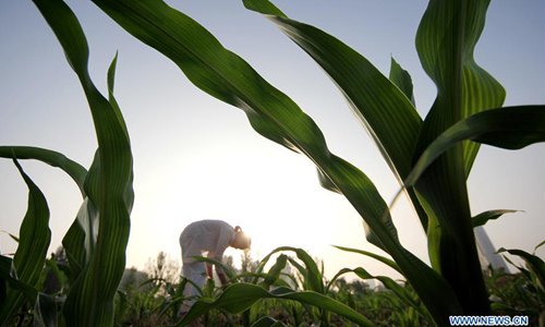 A woman works in the field at Huangzhuang Village of Yong'an Town in Zaozhuang, east China's Shandong Province, July 7, 2018. Saturday marks Xiaoshu, or Lesser Heat, the 11th of the 24 solar terms in the Chinese lunar calendar which means the beginning of hot summer. (Xinhua/Sun Zhongzhe)