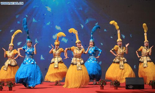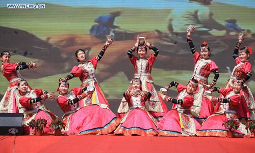 Actresses wearing costumes of Mongolian ethnic group dance during a folk culture tourism festival in Yuquan District of Hohhot, north China's Inner Mongolia Autonomous Region, July 6, 2018. (Xinhua/Wei Yuefei)